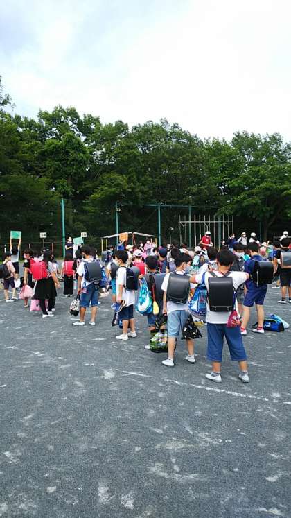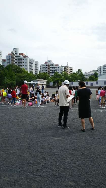 [集団下校訓練]大型台風の接近を想定した集団下校訓練を行いました。地区班別に校庭に並びます。