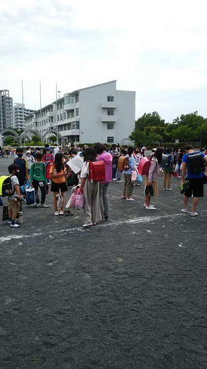 [集団下校訓練]地区班名簿で出欠を確認してから下校します。台風や大雪など、いざというときには活用することもあります。