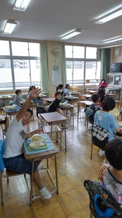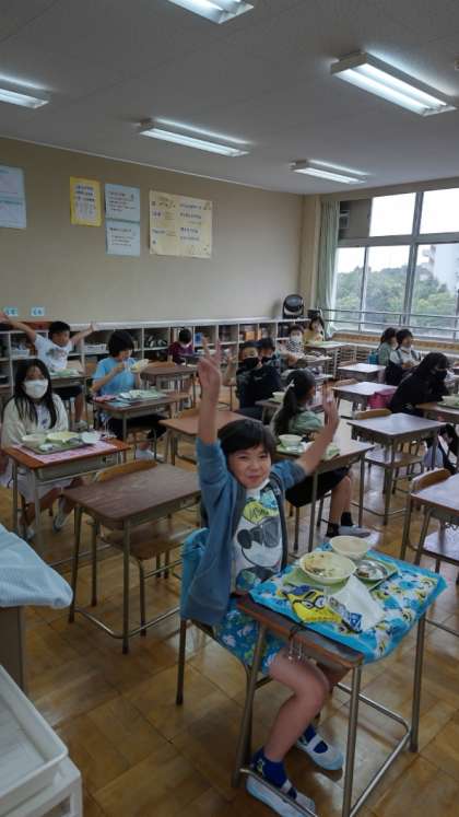 [4年生給食]4年生は人数が多いので2教室に分かれて給食中です。手を振ってくれてますが、ちゃんと黙食しています。