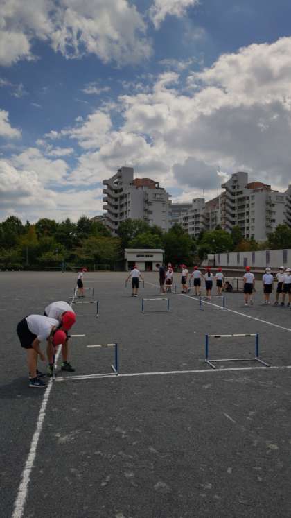 [6年生体育]いい天気の下で6年生が体育をしています。ハードル走の学習です。準備運動をして、ハードルをセットします。