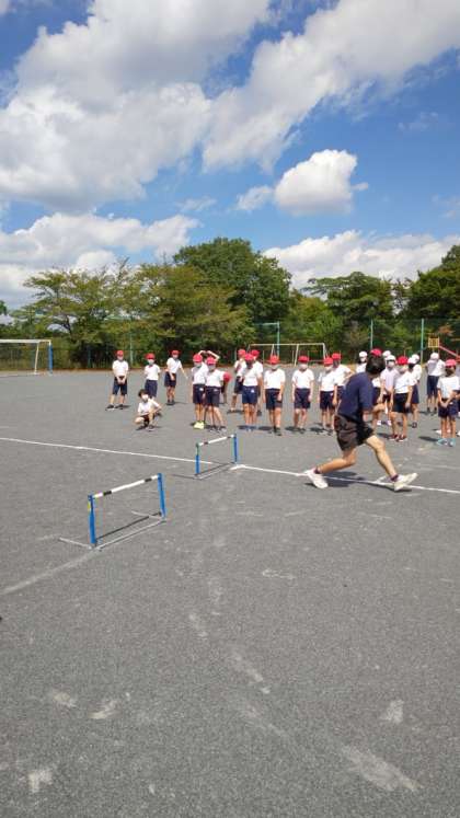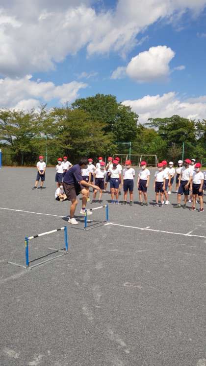 [6年生体育]ハードルとハードルの間は、それぞれの歩幅や速さにあわせて、6m、6.5m、7mの3種類に設定しています。