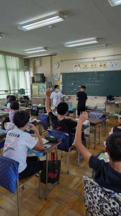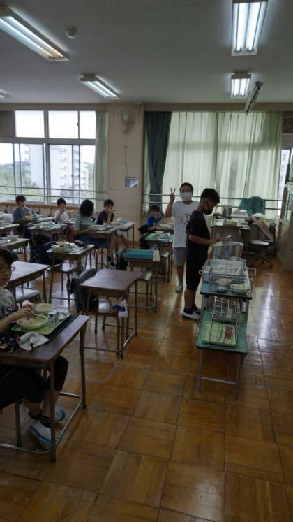 [5年生給食]今日は5年生の給食風景です。さすがに高学年、自分たちでしっかりルールを決めて進めています。