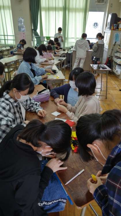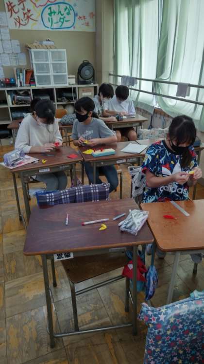 [6年生総合]6年生が一生懸命に何か折っています。小さな折り鶴です。何に使うのでしょうか。