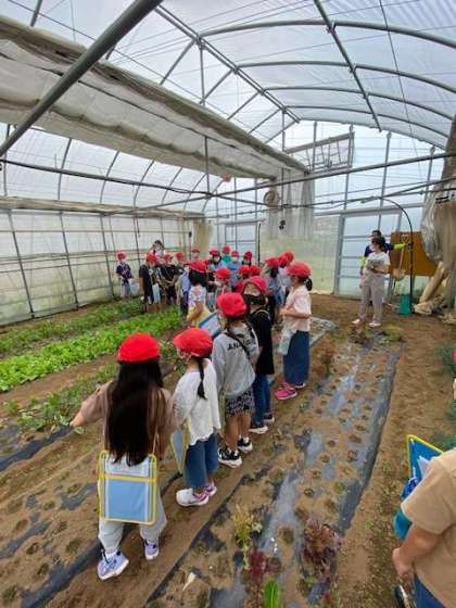 レタスのビニールハウスに入れてもらいました。上からぶら下がっているコードから、スプリンクラーのようにシャワーが!
