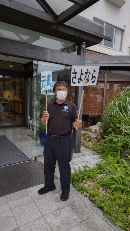 15:55 ゴーシーズの方が手づくりのプラカードでお見送りしてくれました。うれしいです。バスに乗ってすぐに宿舎「潮騒」に着きました。