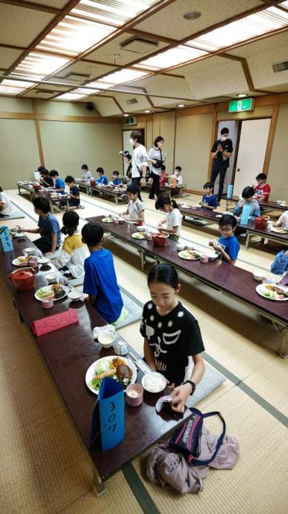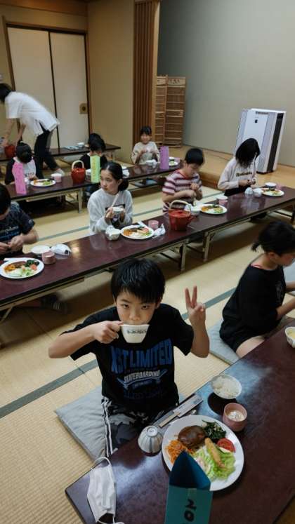 18:20 いつものように黙食しています。同じ方向を向いて、間も空けて座っています。
