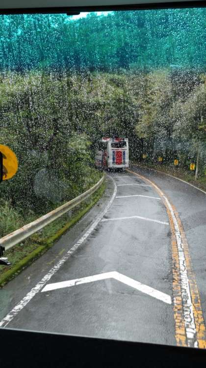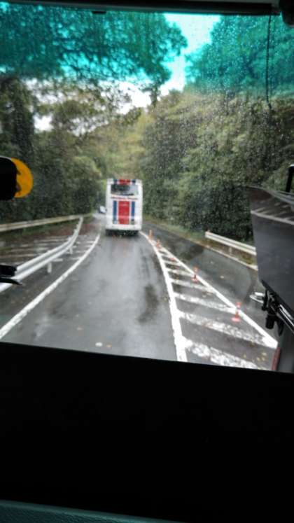 10:45 日本平を下っていく坂道です。雨が強まりました。雨粒の向こうに1号車が見えます。