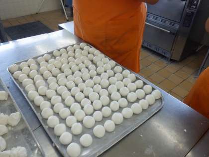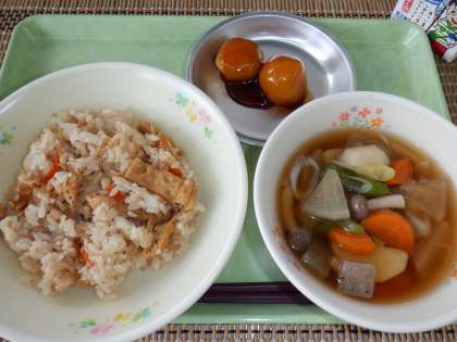給食では、こぎつねごはん、芋の子汁、お月見団子を作りました。