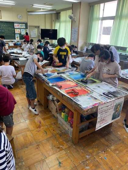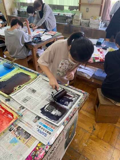紙版画作りをしています。画用紙を好きな形に切り取って、インクを塗って半紙に押し付けます。