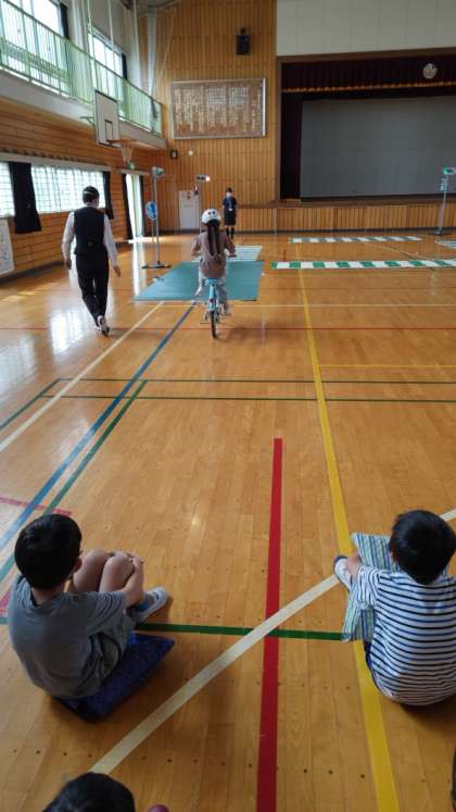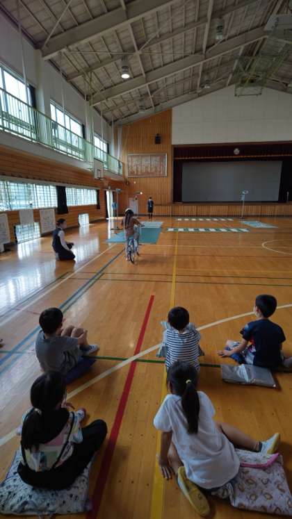 [3年生自転車教室]代表児童が実際に自転車に乗って演技します。みんなが見守ります。がんばって!