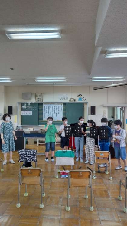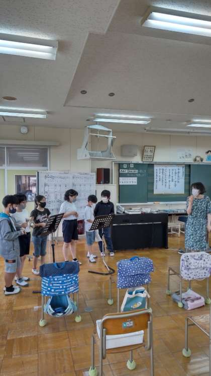 [5年生音楽]ハンドベルを使いながら和音の演奏をします。歌と和音の演奏を合わせています。