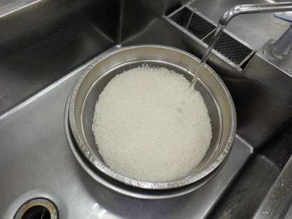 ザルにお米を入れ流水でお米を研ぎ、よく洗って水が透明になるまで流します。