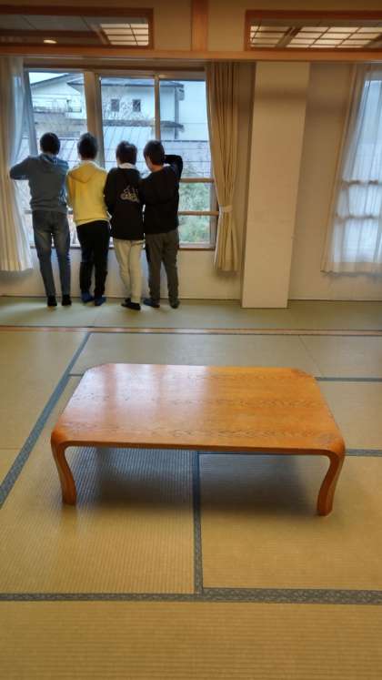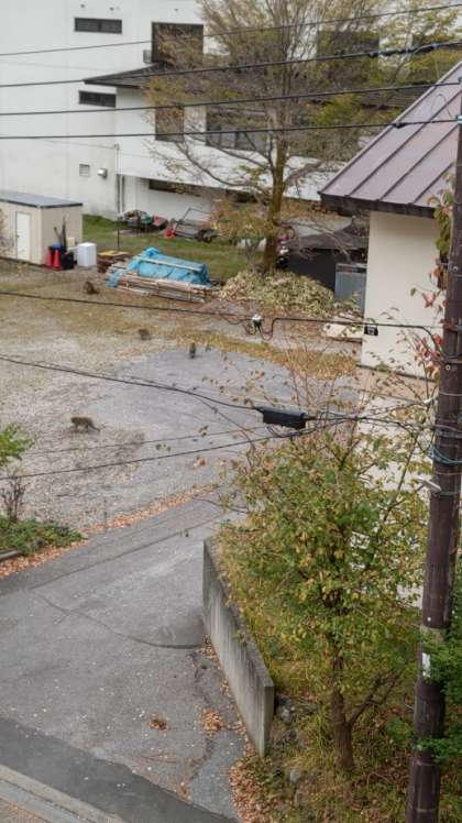 7:10 「校長先生、猿がいるよ」と言われて外を見たら、さっき朝の会をした場所に親子の猿がいました。