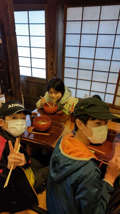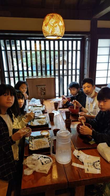 11:40 ミールクーポンを使って食事をしています。蕎麦屋さんが人気です。江戸村の中はたくさんの学校が来ていますのでなかなか下柚木小のみんなだけを撮ることが難しいです。
