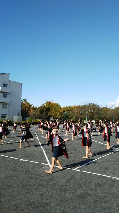 [5年生6年生運動会練習]腰を落として網を引く。ソーラン節はニシン漁の踊りです。
