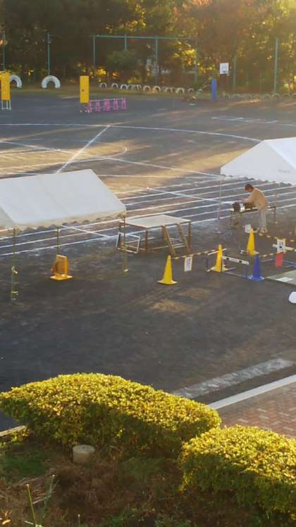 とてもいい天気です。運動会日和です。朝日を受けて早速職員が準備を始めています。まずパソコンをセットしています。