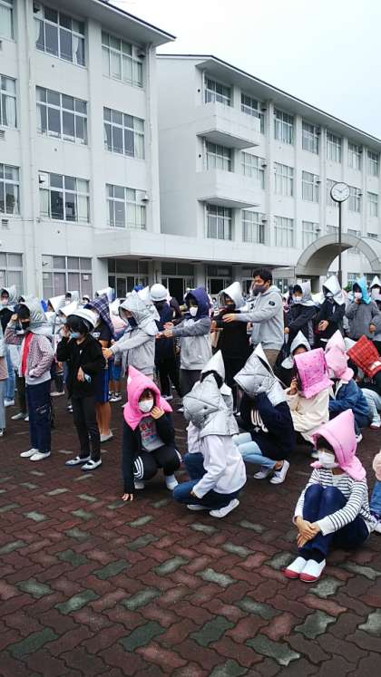 子供たちが中庭に避難してきました。おしゃべりもせず真剣に行動しています。