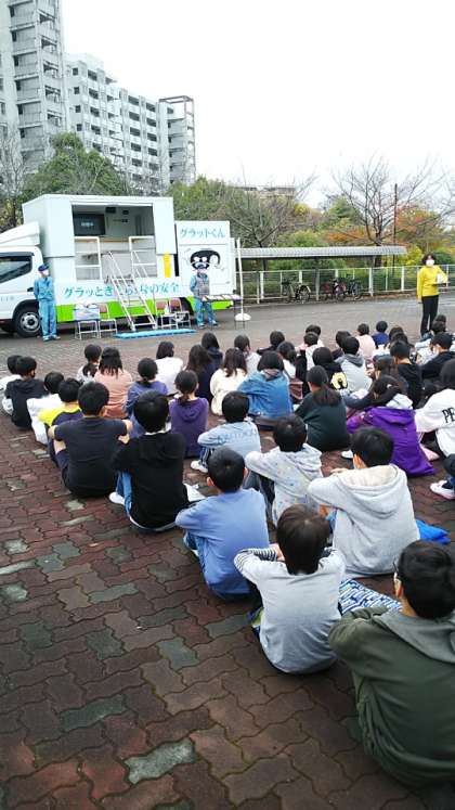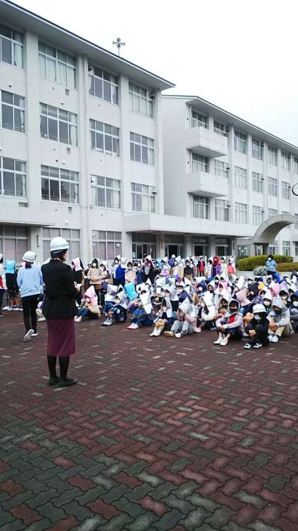 避難開始から全員の人数確認まで約4分。とてもスムーズです。このあと今日は起震車による体験(6年生)があります。
