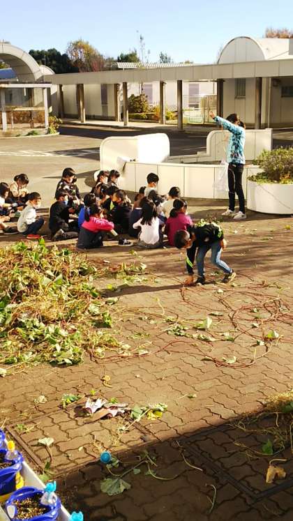 [1年生生活]今日は絶好のサツマイモ収穫日和でした。収穫も一段落して、これから片付けをします。