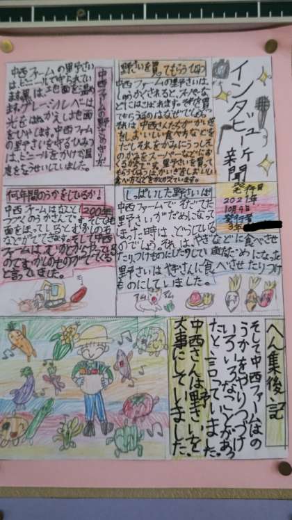 [3年生社会]私は教室や廊下に貼られた子供たちの作品を見ることが好きです。特に社会科新聞はじっくり読みます。社会科を始めたばかりの3年生が八王子市の副読本にも掲載されている「中西ファーム」の見学をし、がんばってまとめた新聞が廊下に貼られていました。社会科新聞はレイアウトの美しさや文章の上手さがポイントではありません。図工や国語でなく、社会です。ここでのねらいは「身近な地域(八王子)における生産の仕事が、地域の人々の生活と密接な関わりをもって行われていることを理解し、表現すること」です。そのために中西さんの畑へ行き、どのように野菜を作っているのか工夫を尋ね、できた野菜はどこへ行くのか、中西さんの思いや願いは何なのかを調べてきました。そして調べてわかったこと、わかって考えたことがその新聞の中に表されるようにしてきました。まだまだ社会科初心者の3年生ですけど、とてもがんばっています。これからさらに力を伸ばしていきたいところです。