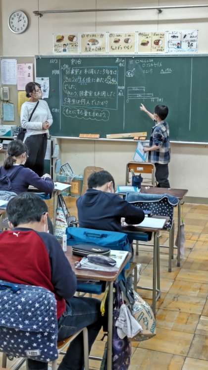 [5年生算数]今日は「もとにする量」の求め方を考えます。自分の考えた方法を板書して伝え合います。