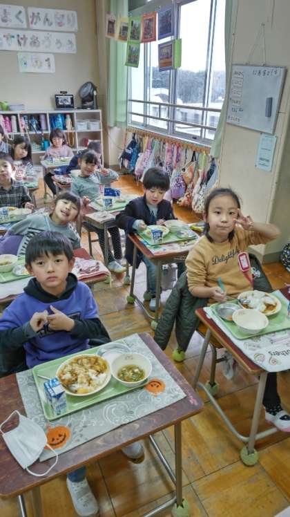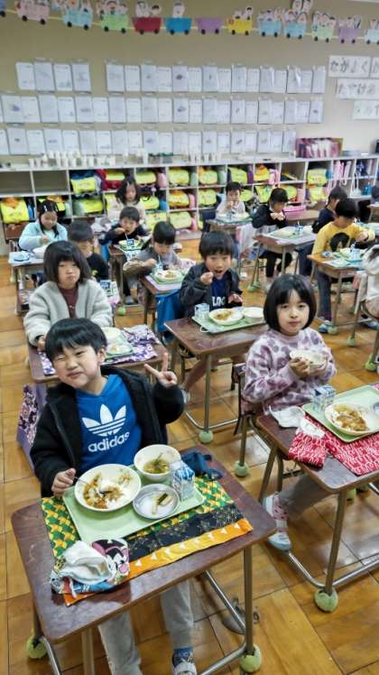 [1年生給食]今日は「みんな大好きカレーライスの日」です。1年生たちも笑顔です。