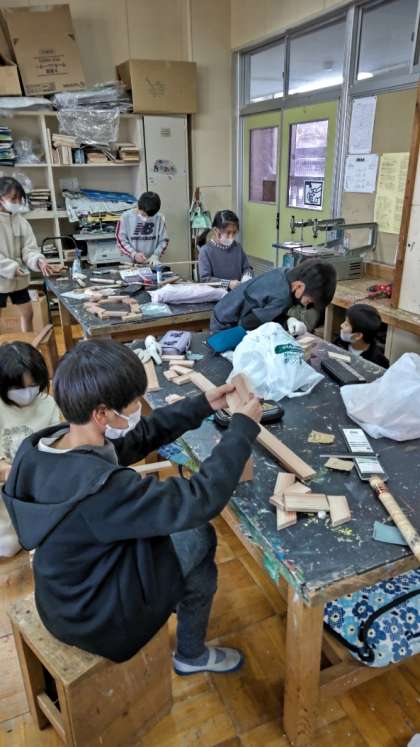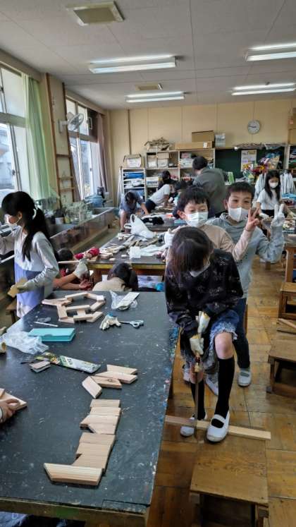 [4年生図工]「ギコギコクリエイター」です。のこぎりを正しく使って安全に作業します。