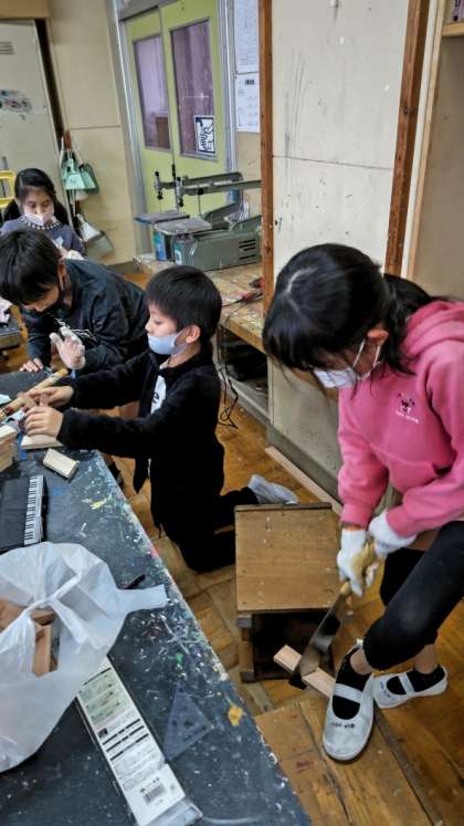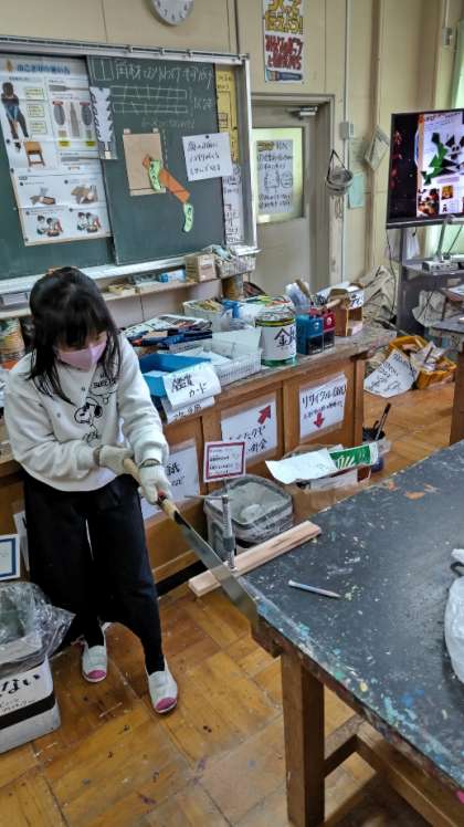 [4年生図工]のこぎりはコツをつかむと上手に使えるようになりますね。木材をしっかりおさえてから切りましょう。