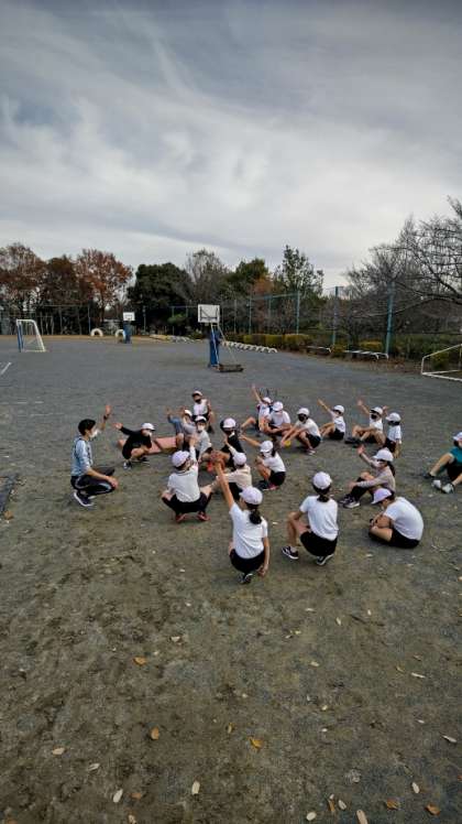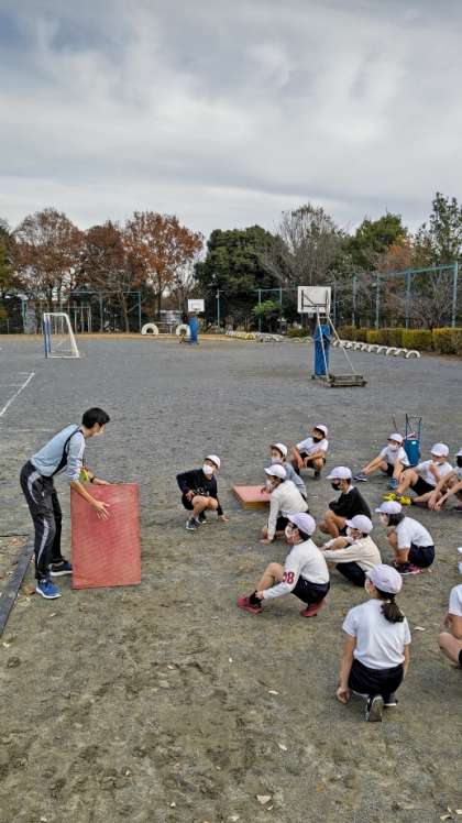 [5年生体育]先生が解説してくれています。板があることでタイミングを合わせ、勢いよく踏み切ることができるのですね。角度もつきます。