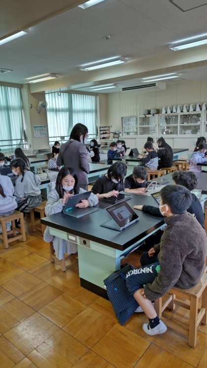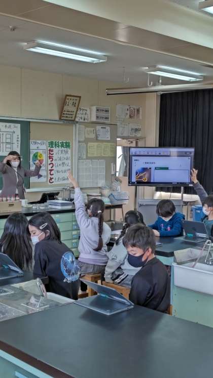 [4年生理科]改めて自分の考えをタブレットで共有します。モニターにはみんなの意見が映されます。タブレットは便利なツールです。