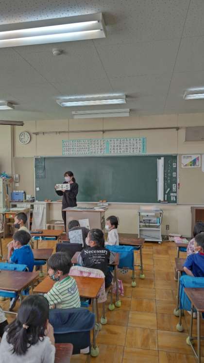 [1年生算数]授業の始めにフラッシュカードでくり下がりの引き算を練習しています。みんなよくできます。