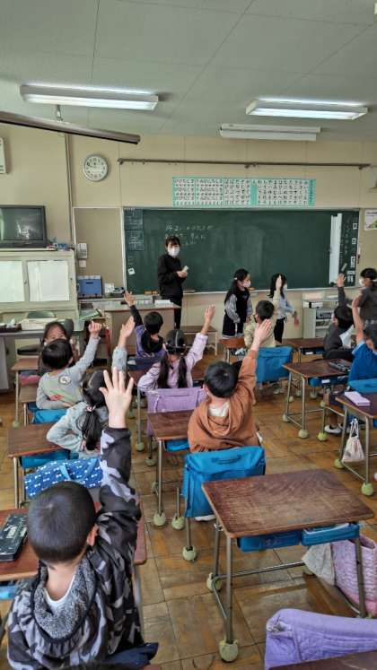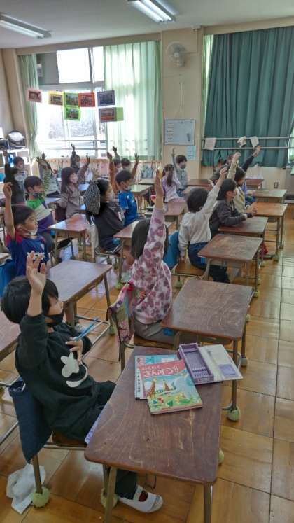 [1年生算数]文章問題の場面を実際に再現しています。この問題のためだけのチケットですが、やっぱり欲しくて手を挙げる子供たちです。