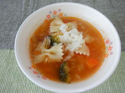 八王子の食材をたくさん使用し刻み玉ねぎ、リボンパスタも入ったスープになります。