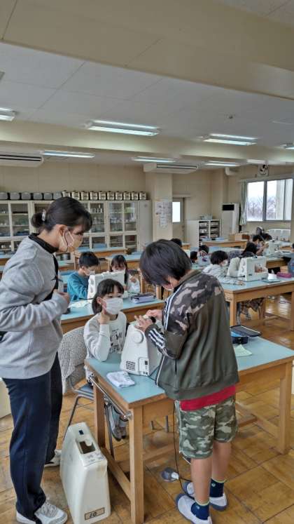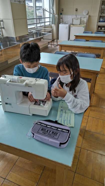 [5年生家庭]ミシンには操作の手順がいろいろとあります。協力し合いながら練習しています。