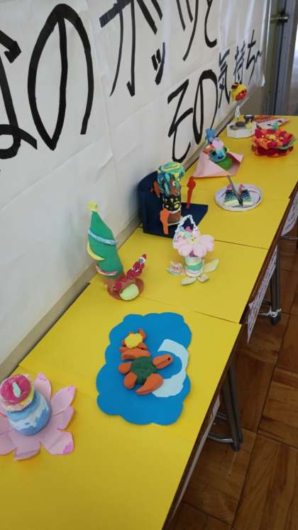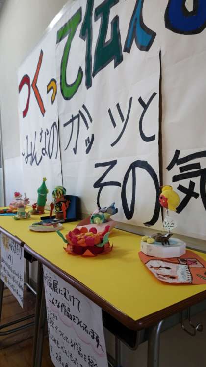 職員室前ミニギャラリー、今度は4年生「元気のおまもり」です。紙粘土で「元気」のイメージを作品にしました。