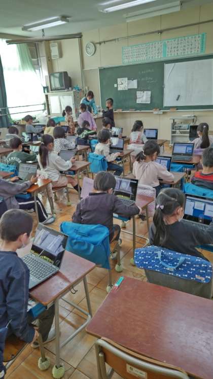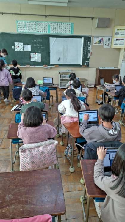 [1年生国語]今日はおうちにタブレット端末を持ち帰る日です。1年生はミライシードをやっています。冬休みに自分でできるように操作を確かめています。