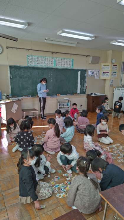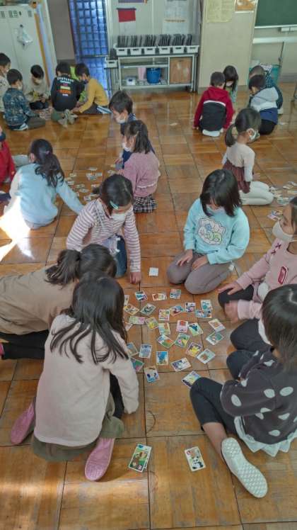 [1年生国語]カルタ遊び。クラスみんなで遊ぶと楽しいですね。マスクもみんなきちんとしています。