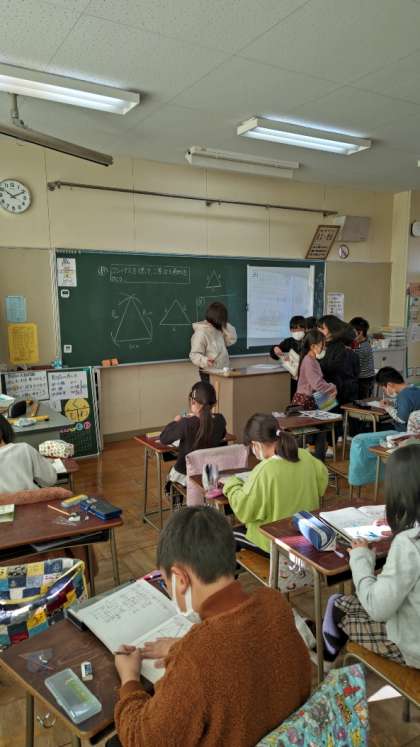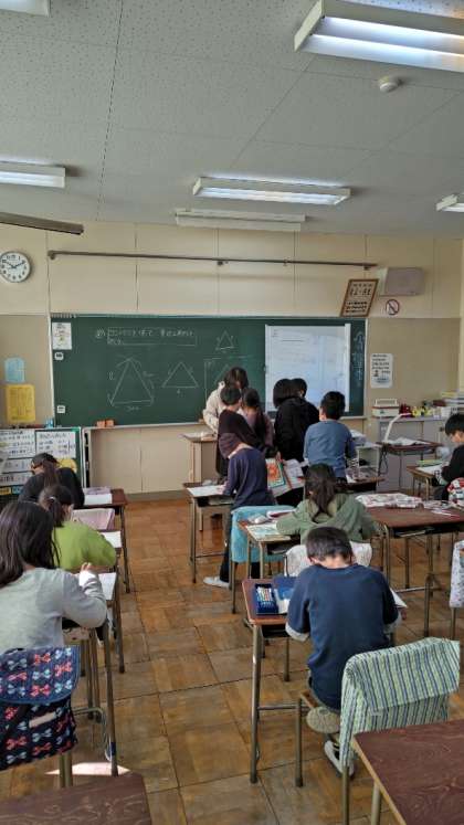 [3年生算数]「三角形」の学習です。今日はコンパスを使って二等辺三角形の書き方を確認しています。