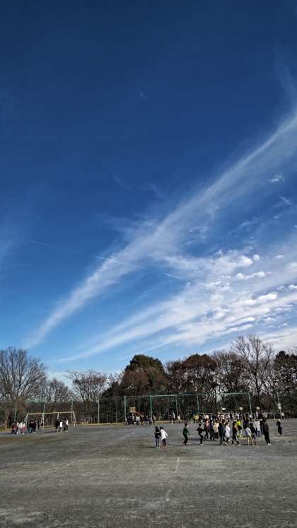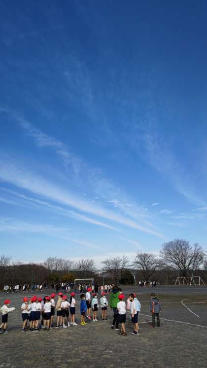 たなびく雲が清々しい冬の空です。記録会までしばらく子供たちの大縄跳びが見られます。