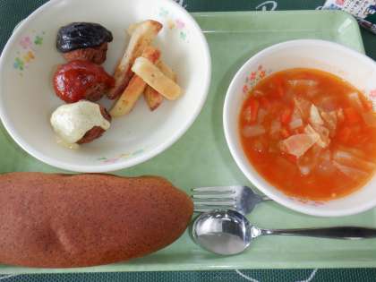 給食でも三色のソースでドイツ国旗になっています、またポテトはDr.肥沼が大好きだった桜をのせました。