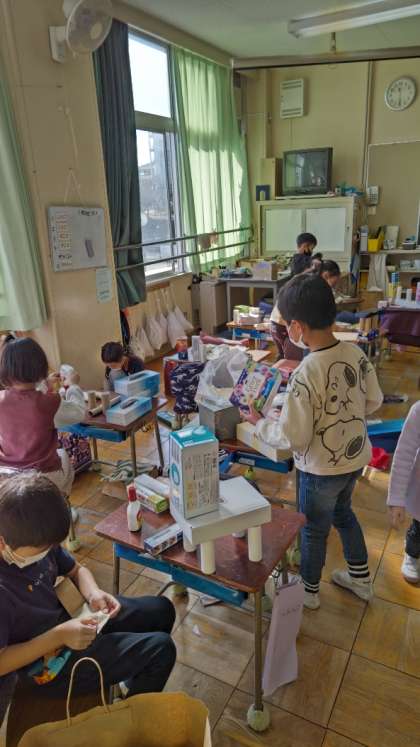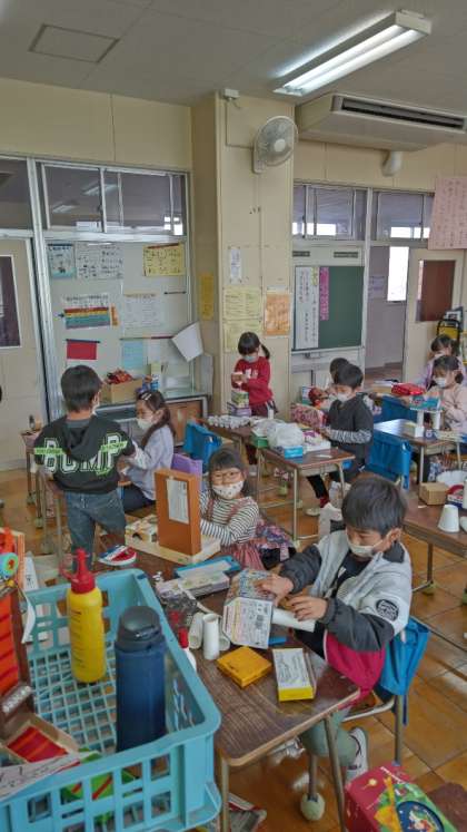 [1年生図工]箱を並べたり積んだりして、作りたいものを考えます。そしてボンドやガムテープで接着していきます。