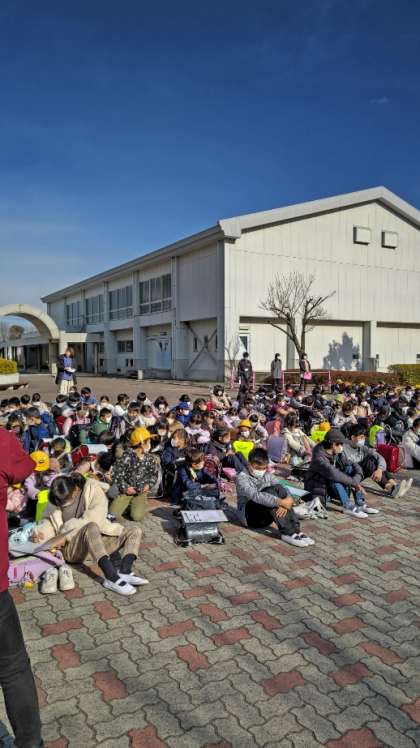 (6年生たちがしっかりと班をまとめています。静かに集合完了、全学年とても立派です)