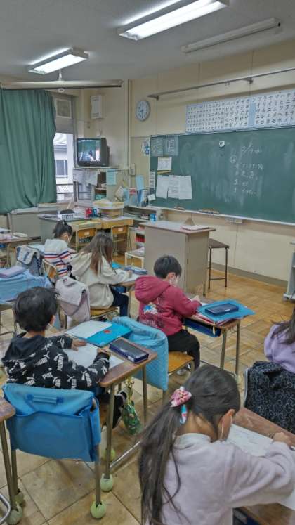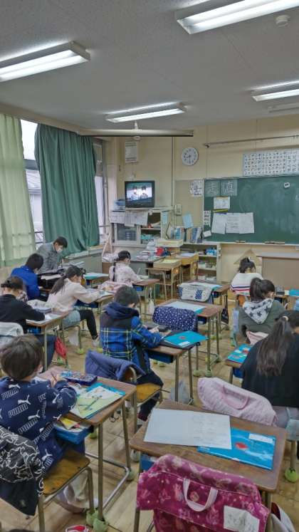 今朝は代表委員会からのテレビ集会でした。下柚木小のマスコット「しもたろう」の絵描き歌の紹介でした。2年生がテレビを見ながら描いています。