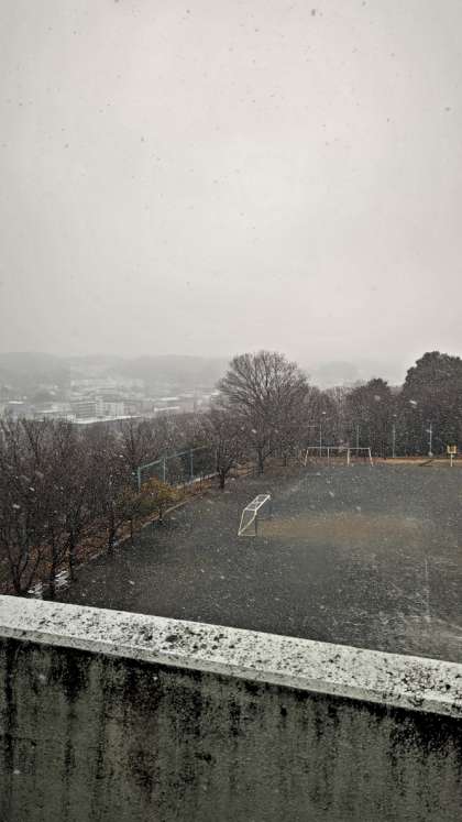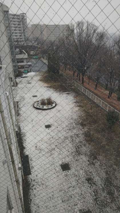 雪は降り続いていますが、中庭も周囲の道路も今のところ積もっていません。裏庭だけうっすら白くなっています。予報では夕方以降が積雪の可能性とのことで、子供たちの下校は予定通りで大丈夫そうです。気を付けて下校するように伝えます。