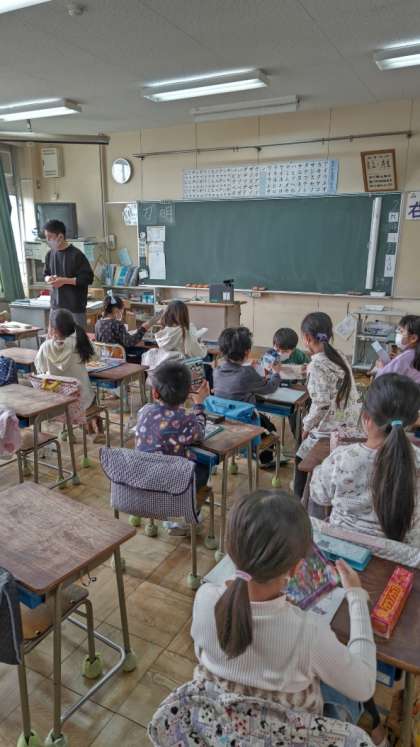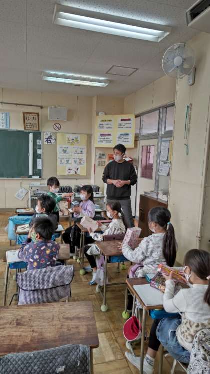 [2年生算数]「はこの形」の学習です。今日はみんな思い思いの箱を持ちよっているようです。