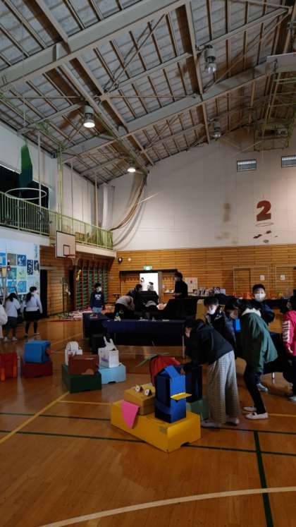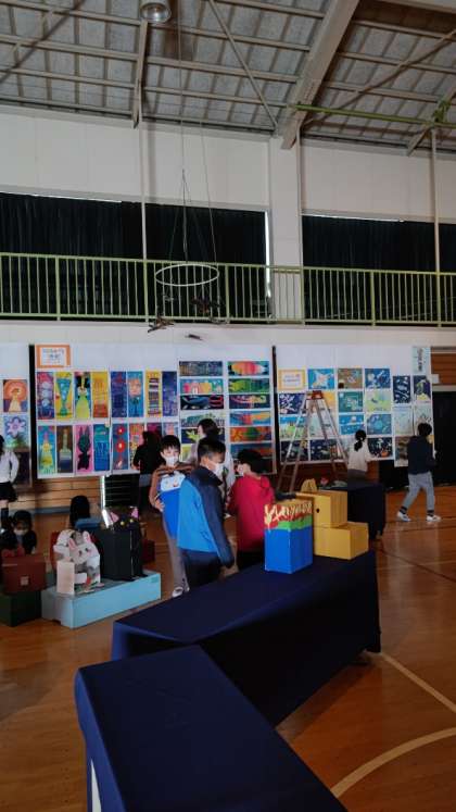 [4年生作品展準備]4年生が立体作品の搬入をしています。学年が重ならないように調整しながらの搬入です。