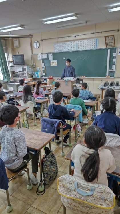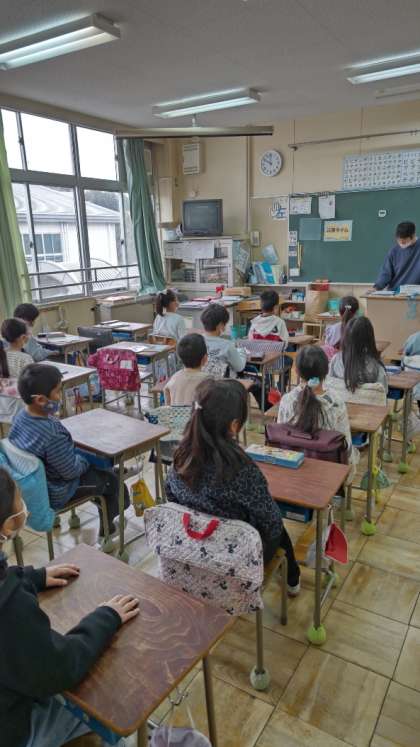 [2年生学活]今日はこのあと4時間目に「6年生を送る会」があります。2年生がプレゼントを渡す言葉の練習をしています。