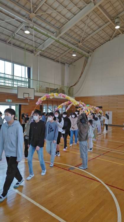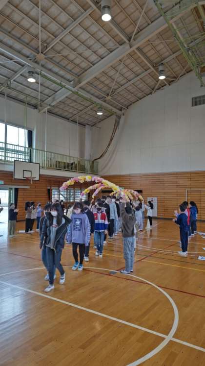 [6年生を送る会]4時間目になりました。6年生を送る会が始まりました。3年生がアーチで迎えます。