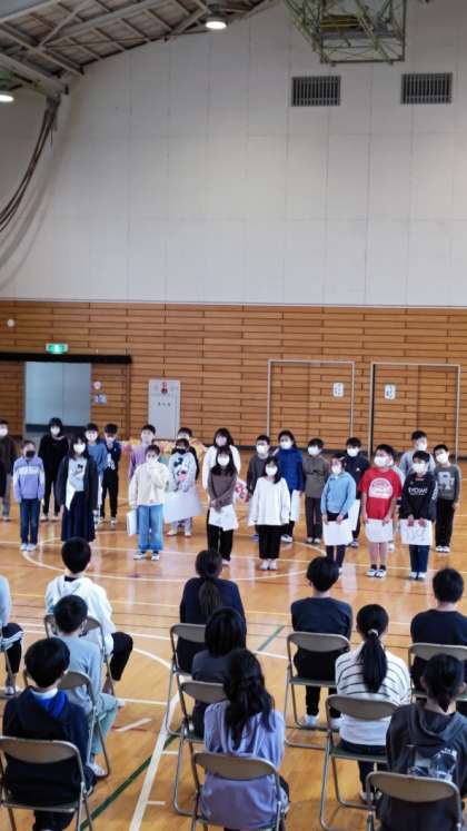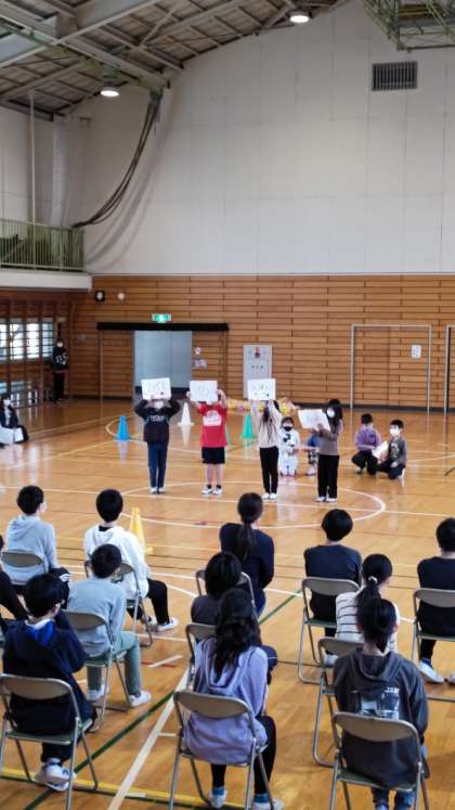 [6年生を送る会]他の学年は各教室にいて、オンラインで体育館の様子を見ています。まずはじめは3年生の出し物です。