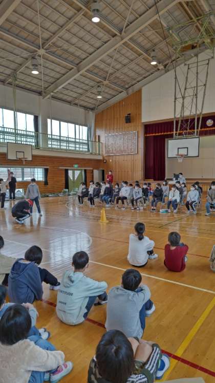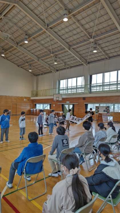 [6年生を送る会]5年生は劇を披露しています。6年生が活躍したいくつかの場面を振り返っています。